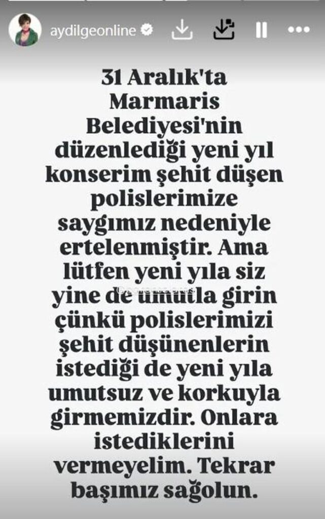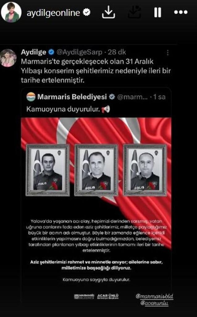 Yalova’da güvenlik güçlerinin düzenlediği operasyonda çıkan çatışmada üç polis hayatını kaybetti. Olayın ardından ülkede birçok etkinlik iptal edilirken, Aydilge de Marmaris’teki konser programını durdurma kararı aldı.