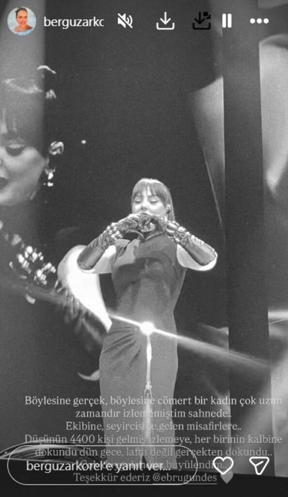 Bergüzar Korel’in sözleri, konserin izleyici üzerindeki etkisini net biçimde ortaya koydu. Binlerce kişinin aynı anda aynı duyguda buluştuğunu söyleyen Korel, Ebru Gündeş’in sahnede bunu gerçekten başardığını dile getirdi.